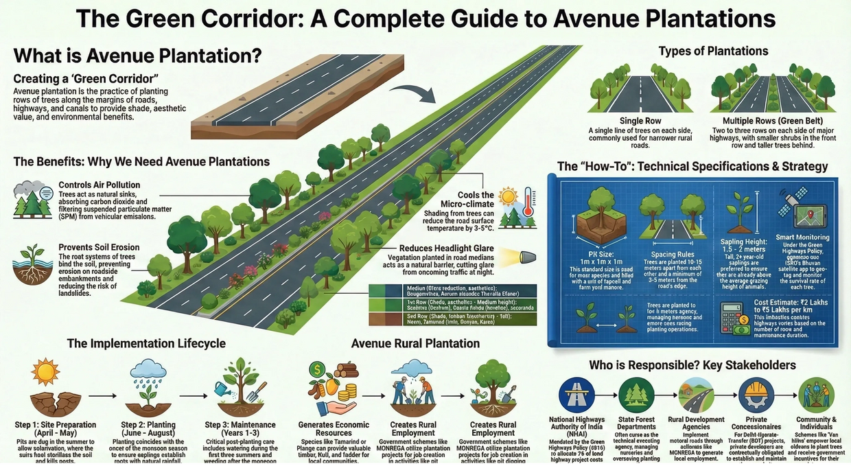 Technical and logistical guide on avenue plantations, defining the practice as the systematic planting of trees along transportation corridors like roads and canals. It explains that this practice serves as a critical component of environmental engineering, going beyond mere aesthetics to provide functional benefits such as pollution control, micro-climate regulation (reducing heat), and soil conservation.