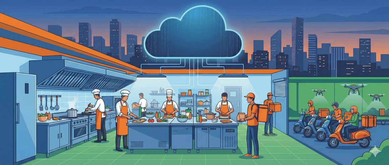 Cloud Kitchens are centralized commercial kitchens used by one or more food brands to prepare dishes solely for delivery or takeaway. They do not have dining tables, waiters, or customer-facing interiors like traditional restaurants; instead, they operate behind the scenes, connected to customers through apps and websites.